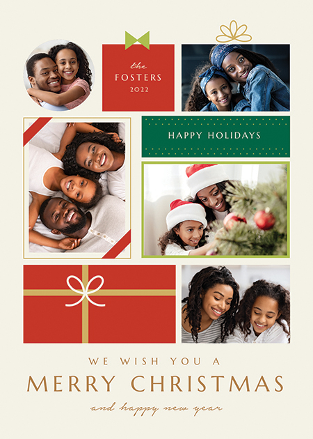 This holiday photo card features photos in a Box Set Collage with a “We Wish You A Merry Christmas/Happy New Year” Message. Upload your Family Holiday, Kids, Pets, Etc. May be customized with your name(s). Sold and stock availability is per pack.