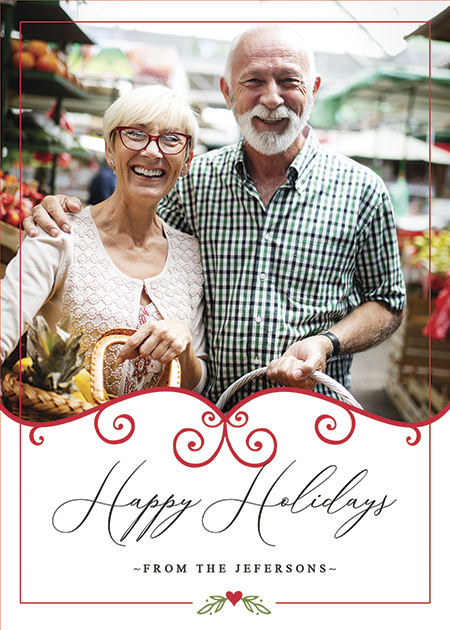 This holiday photo card features a single photo on an illustrated Christmas background with a Happy Holidays Message. May be customized with your name(s). Available in red, blue, green or white base. Sold and stock availability is per pack.