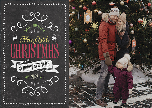 This holiday photo card features a single photo with an illustrated Sidebar with” have Yourself A Merry Little Christmas and Happy New Year (ribbon) Message. May be customized with your name(s). Sold and stock availability is per pack.